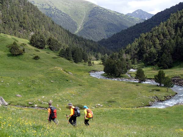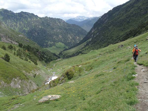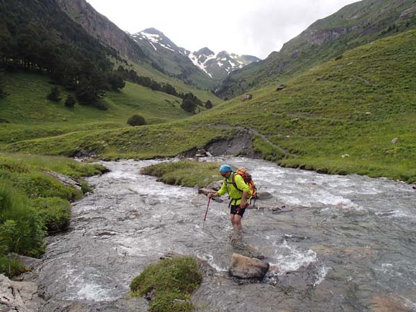 Travessat el riu, seguírem pel marge dret, per un bon camí que ens dugué a un rierol que també haguérem de travessar com poguérem, i arribàrem a l’Arriu deth Horcalh (1780 m) i a un segon rierol que calia passar per una pasarel·la que no hi era, per tant ens tocà llevar-nos les botes i creuar amb l’aigua pels genolls.