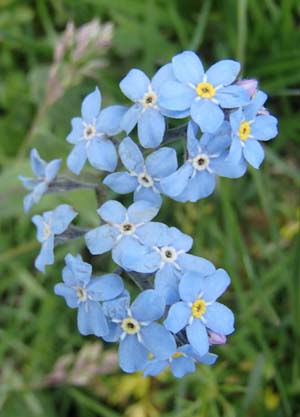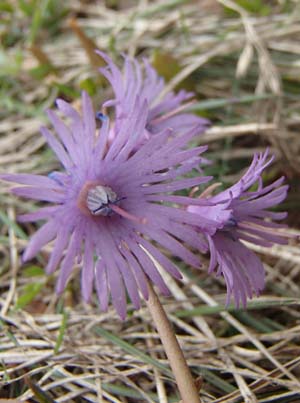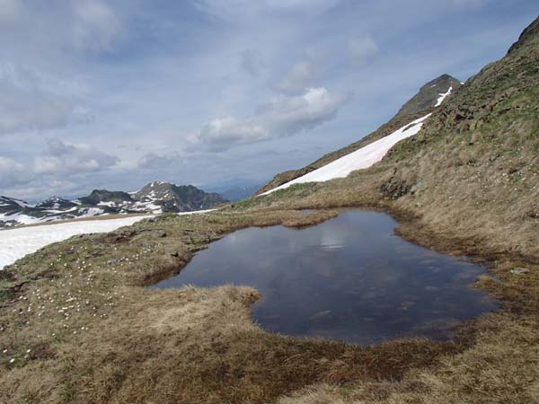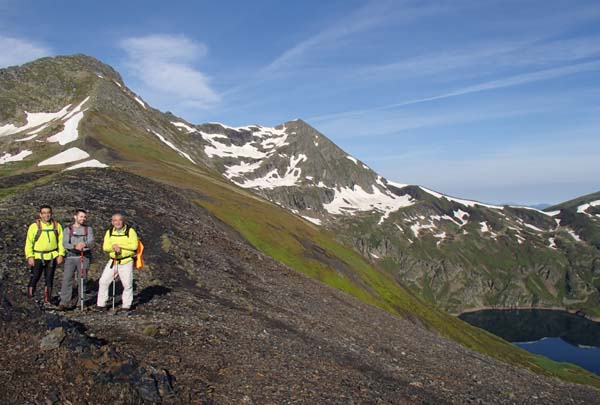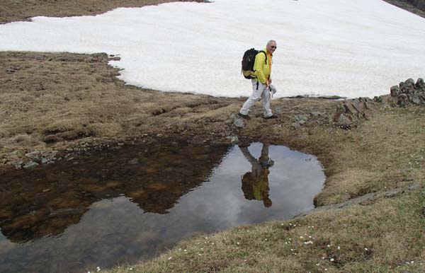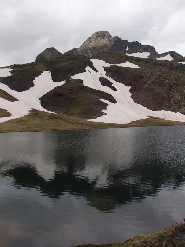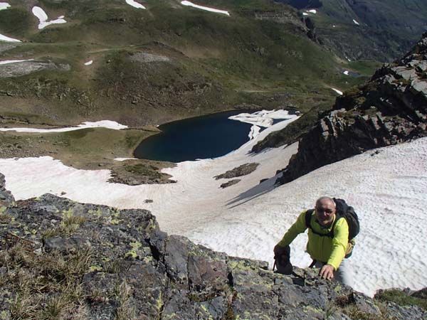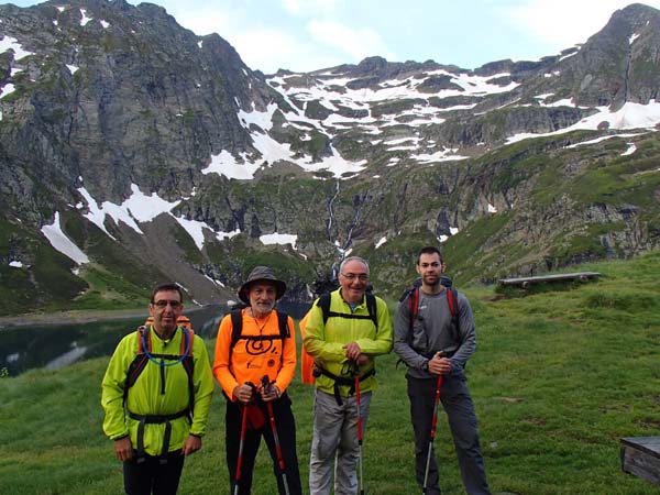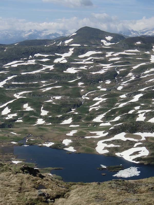 Al fons vèiem una preciosa vall amb un llac ple de blocs de gel (Estanh Long de Liat). El camí es creua amb el que ve del Pòrt de l’Horqueta (el camí alternatiu del qual parlava el guia del refugi d’Araing). No ens havíem de desviar, havíem de seguir per l’esquerra. Des del creuer començàrem una remuntada cap al SSE (aquesta zona es diu Pales de Liat) que ens dugué als Estanhets de Maubèrne (2350 m). En els prats començaven a sortir els primers narcisos.