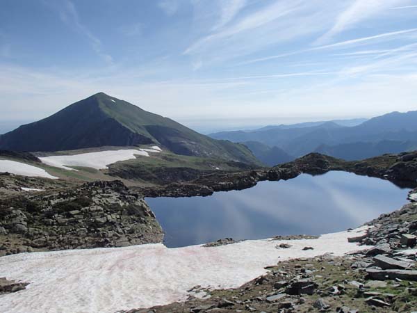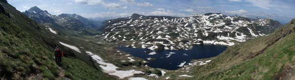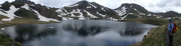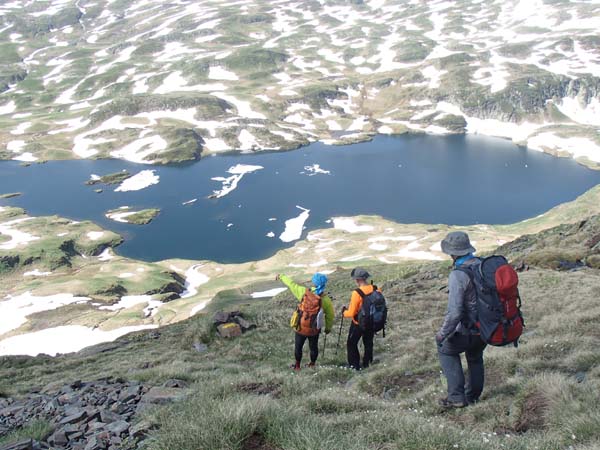Des d’aquell punt, la baixada és molt forta, per les pales de Montoliu, fins al preciós llac del mateix nom (2340 m). No poguérem resistir la temptació i decidírem quedar a dinar al seu costat. Ens llevàrem les botes i ens tombàrem a l’herba, mirant el paisatge encisador.