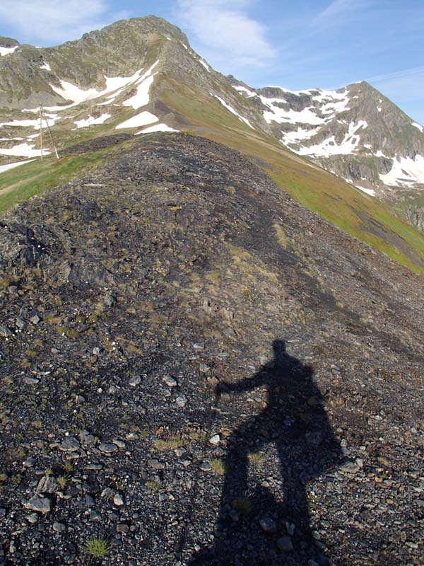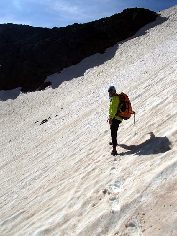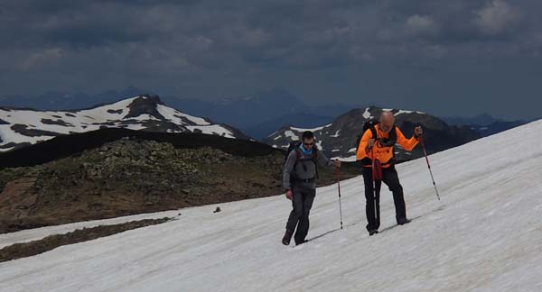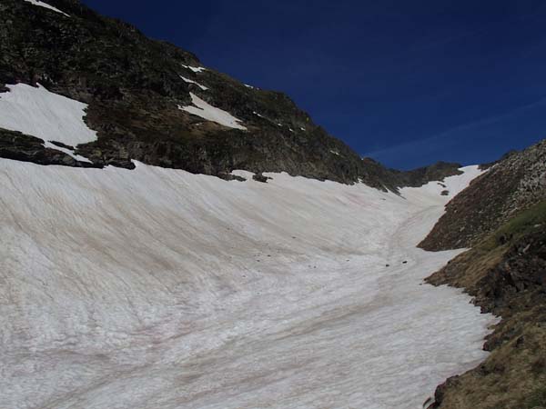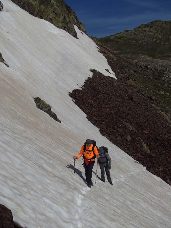 Des del coll ascendírem a poc a poc cap al Portilhon d’Albi, primer per la carena i després girant cap al vessant est de la muntanya, travessant unes glaceres gairebé planes i fent un parell de revolts pronunciats que ens feren guanyar alçada.