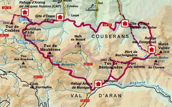 Refugi d’Araing (1965 m) – Coll d’Araig (222 m) – Portilhon d’Albi – Coth de Maubèrne (2468 m ) – Cloth de Montliu (2470 m) – Bac des Cardigassos – Montgarrí