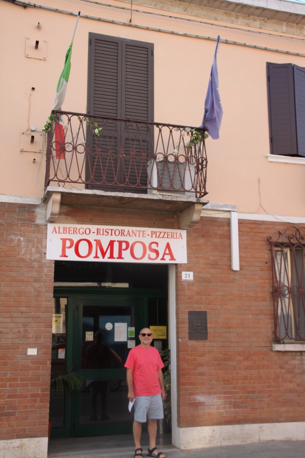 Nosaltres deixam el cotxe a via IV Novembre que desemboca a la mateixa plaça que ha estat remodelada i no s’hi pot aparcar. L’antiga fonda El Bosco Eliceo ara es diu “Albergo-Restaurante-Pizzeria Pomposa” i per dins recorda la descripció que se’n fa a l’”Airone”. A la plaça, els locals comercials i bars d’aleshores han estat substituïts per altres negocis, jugam a endevinar què hi havia on ara hi ha…