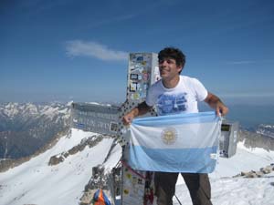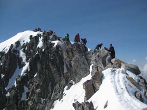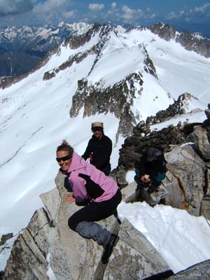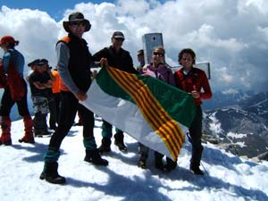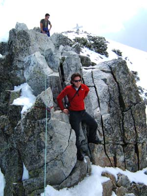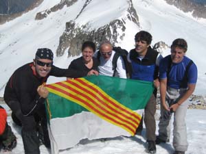 Deixàrem els piolets, pals i motxilles i, aprofitant un impasse del grup que teníem al davant (no es decidien a passar o no), pujàrem ràpidament els darrers metres fins el cim. El Pas de Mahoma no és gaire difícil, però el sobam que hi ha a dreta i esquerra imposa. No és estrany que molta gent ho deixi fer i es quedi sense passar. De fet, es considera que s’ha pujat, ja que sols el separa del cim uns pocs metres i no val la pena passar-ho malament. En un pocs minuts vàrem ser al cim i ens férem les típiques fotos individuals, en grup (amb la bandera i sense) devora la creu.