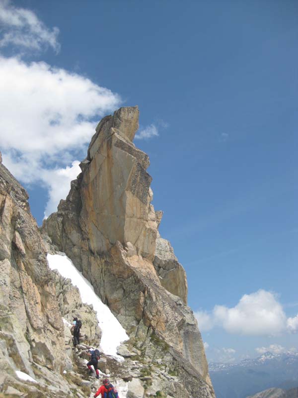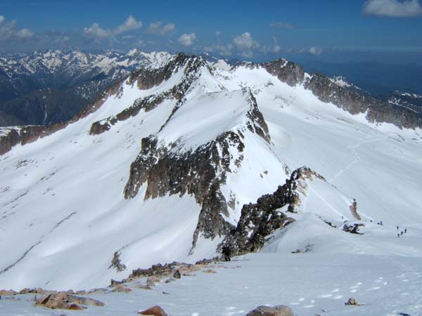 Ens comentaren que al cim hi ha gairebé tres metres de neu i que el temps havia de canviar. Algú parlà de pluja a les tres del capvespre. Amb el sol que feia i la vista que divisàvem, ens semblà mentida, però, qui ho va dir pareixia molt segur. Tornàrem a desfer pel pas de Mahoma, i ja vàrem haver d’esperar que passàs un nombrós grup (no he dit que cal passar d’un en un i en un únic sentit). Així i tot, en poc temps vàrem ser devora els companys que ens esperaven i manifestàrem la nostra alegria per haver aconseguit el cim i estar prou bé per a iniciar la tornada sense problemes. Decidírem començar la baixada.