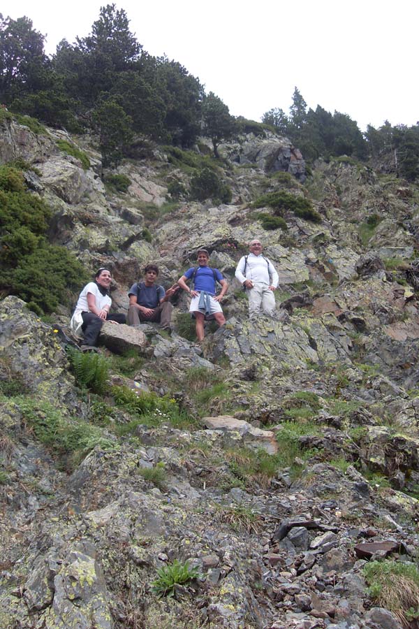 Dia 27, diumenge, ens aixecàrem un poc més tard, devers les vuit. Prenguérem el desdejuni amb tranquil·litat – de fet, a aquelles hores el refugi era buit, tothom pujava cap l’Aneto des de feia hores- , pagàrem i reprenguérem la baixada a cercar l’autobús. El dia estava tapat i es veien els cims emboirats. En arribar als cotxes, alguns decidírem anar a estirar les cames, fent una excursió senzilla, i uns altres s’estimaren més anar a l’hotel llogat a Castejón de Sos i fer turisme. Jo em vaig apuntar a caminar, així que anàrem als Baños de Benasque (1.680 metres) on aparcàrem el cotxe i iniciàrem la pujada als Ibons de l’Alba, sabíem que no podíem pujar al cim per qüestió de temps i de botes (estaven encara xopes del dia anterior, i no volíem trepitjar neu, una altra vegada). Just devora el pàrquing surt un caminoi pedregós, en suau pujada, que travessa la vessant de la muntanya fins arribar a una canal estreta, amb restes de neus, es tracta del barranc o canal del Turonet. La pujada és agra i aèria. De fet, en poc temps tots bufàvem de valent.