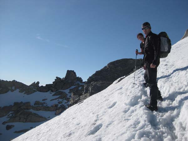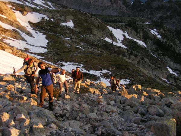 En arribar a la neu alguns ens posàrem els grampons i traguérem els piolets o pals, d’altres esperaren un poc més. L’estat de la neu i les petjades marcades facilitaven l’ascens. Així com pujàvem i s’ampliava la visió de la vall (pic d’Alba, ibón de la Resclosa) il·luminada pels raigs de sol matiners, començàvem a sentir l’ambient d’alta muntanya de l’excursió. Férem dues llargues pendents nevades, enllaçades, per girar a l’esquerra per un camí evident (cap a la dreta és las Madaleta). A unes roques, a dalt de les glaceres, esperàrem i férem un mos. El grup ja s’havia dividit en dues parts definitivament.