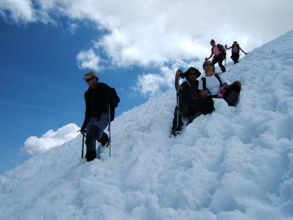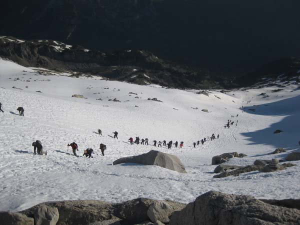 Desférem el camí de pujada, mentre la gent s’acumulava davant el pas de Mahoma. De fet, quedaren desenes de persones fent coa. Decidírem baixar el primer tram i aturar-nos a una roca per a menjar alguna cosa (els peus els dúiem ben xops) i esperar els companys que encara pujaven. Ens saludàrem, comentàrem la jugada i quedàrem que els esperaríem una estona, a unes roques planes que hi ha enmig de la glacera de l’Aneto.