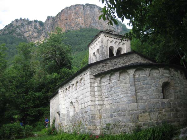 Resultà ser un camí de carro que, en un primer moment, voreja el riu Urmella i després s’endinsa entre grans arbres cap la localitat d’El Run. Travessàrem aquest poblet de carrers estrets i cases de pedra, fins a les fonts del Run i seguírem un frondós sender que pujava cap a l’església romànica-lombarda de Gràcia. Es tracta d’una preciosa esglesieta situada en una clariana enmig del bosc. Férem quatre fotos i ens vàrem seure en uns bancs, gaudint del lloc i del silenci.