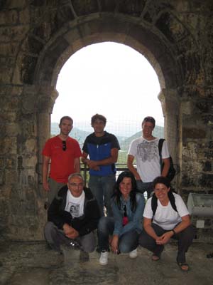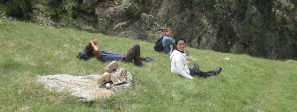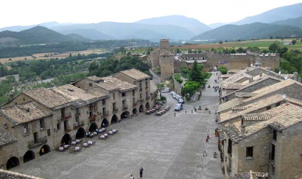 Semblava que plovia, però seguírem tombats a l’herba, absorts amb la vista. Algú ens despertà de l’encanteri i enfilàrem la baixada a corre-cuita, tot i que el caminoi banyat pot tornar-se perillós. Per sort, quan començà a ploure (i ho va fer de valent) ja érem prop dels cotxes, la qual cosa no impedí que arribàssim ben xops. Xops però contents, partírem en cotxe cap a Castejón de Sos. Allà teníem reservat l’hotel, que per cert ens causà molt bona impressió. Férem una dutxa ràpida i sortírem cap a Ainsa, on els altres companys ens esperaven, tot dinant a l’impressionant plaça medieval porticada de la vila. El poble és preciós (i molt turístic). Visitàrem la plaça Major, pujàrem a la torre de l’església (magnífiques vistes de la vila i dels rius Ara i Cinca) i entràrem al castell d’Ainsa, vorejant les murades.