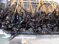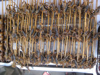 De camí a un altre monestir, trobàrem un carrer ple de paradetes, on feien menjar de tota casta (hi havia de tot, pinxos, sopes, insectes, aranyes, cavallets de mar…), amb un ambient molt carregat. Ja havíem dinat, però encara n’hi hagué que provaren aquestes delicadeses. En sortir ens dirigírem a una zona comercial (de nova creació) amb diversos temples i palaus. Com que se’ns feia tard, partírem a la recerca d’una mesquita musulmana xinesa, férem un tomb pels voltants (no ens hi deixaren entrar) i en sortir cercàrem un tut-tut, un motoret per a quatre que, per una mòdica quantitat, ens dugué a l’hotel a cercar les maletes. I partírem cap a l’estació. Arribava el moment de provar un nou mitjà de transport, encara inèdit a Espanya: l’autobús-llitera. Embarcàrem, i en marxa! A les quatre de la matinada ja érem a Beijin (Pequín) .