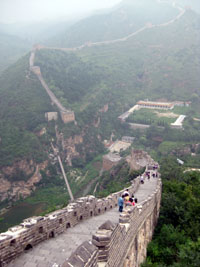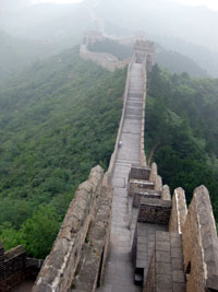 El caminar és feixuc: ara escales, ara rampa, ara cap amunt, ara per avall… A més, fa molta d’humitat. Cada vegada que ens apropàvem a les torres, una gernació de venedors ens oferia tota casta de begudes i souvenirs. Si no compres ràpidament, abaixen els preus. Primer férem una zona descendent, cap a l’encletxa d’un riu, que travessàrem per un pont penjant; després, una forta pujada. Així alternàvem zones de pujada i zones de baixada. La Murada s’adapta a l’orografia, seguint la carena muntanyosa. La conservació de la murada va per trams, ara bé, s’ha de dir que la van restaurant a poc a poc, bocí a bocí. A l’arribada a Jingshaling, trobàrem la zona més ben conservada, amb un tram d’especial bellesa. La Murada sembla que serpenteja, fent curiosos revolts. Baixàrem amb un altre telefèric i dinàrem de pa i taleca.