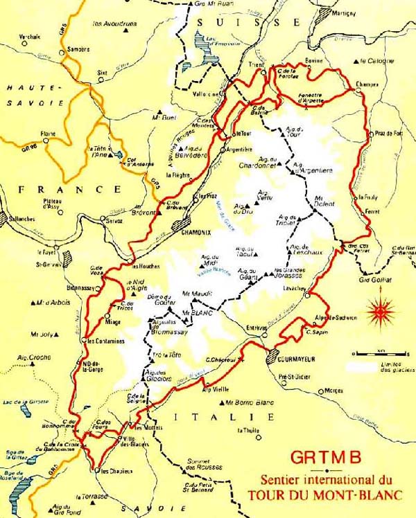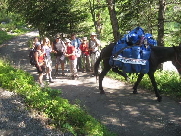 Setmanes enrere organitzàrem una sortida per fer una ruta clàssica anomenada Tour del Mont Blanc. Es tracta d’un GR senyalitzat que volta el massís per les valls que el voregen. Hi ha tota una infraestructura de refugis, xalets, punts informatius i senyals indicadores que faciliten la ruta als senderistes. Nosaltres varen optar per anar amb amb un grup reduït, un guia i un mul que transporta part del material. La volta completa es fa normalment en 7 etapes de diumenge a dissabte durant els mesos de Juliol i Agost, fent alguns trams en transport públic.