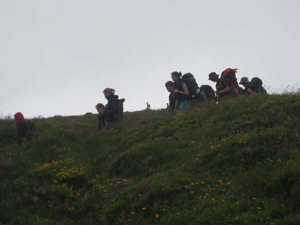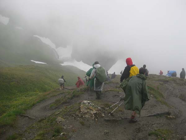 Tota la nit va ploure. Però va ploure amb ganes. De matí, a les 7:00, encara plovia, afortunadament amb menys intensitat, i les perspectives no eren gens bones. Després d’aixecar-nos a corre-cuita i prendre el desdejuni (prou bo, amb mantega, confitura i mel casolanes), ens preparàrem per sortir, amb capelina, polaines i tota casta de remeis contra la pluja. Quan començàrem la pujada del Gran coll de Ferret (2.537 m) encara plovia lleugerament, així que enfilàrem l’ascensió enmig de núvols i boires. A estones podíem veure la vall, però a mesura que guanyàvem alçada la visibilitat anava minvant. De fet, en arribar al coll que fa partió amb Itàlia, una boira expesa ens envoltava completament i just podíem veure els companys que teníem a prop.