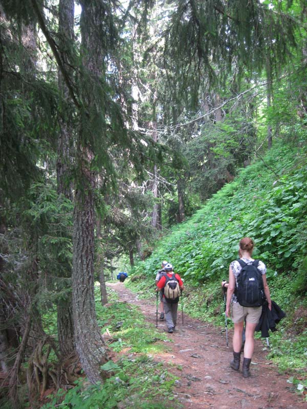 Seguint l’horari previst, a les 7:00 prenguérem el desdejuni i a les 8:00 iniciàrem la caminada cap a la zona d’acampada, on recollírem el dinar i iniciàrem la pujada al coll de Forclaz (1.528 m). La ruta passa per un humit bosc que, primer suaument i després de forma més abrupta, puja constantment fins arribar a una canalització (sembla que duu aigua a la ciutat de Martigny des del glacera de Trient). En aquest punt el camí perd pendent i ofereix unes magnífiques vistes sobre Trient i la seva vall. La pujada té una llargària de devers dos quilòmetres.