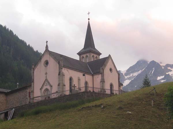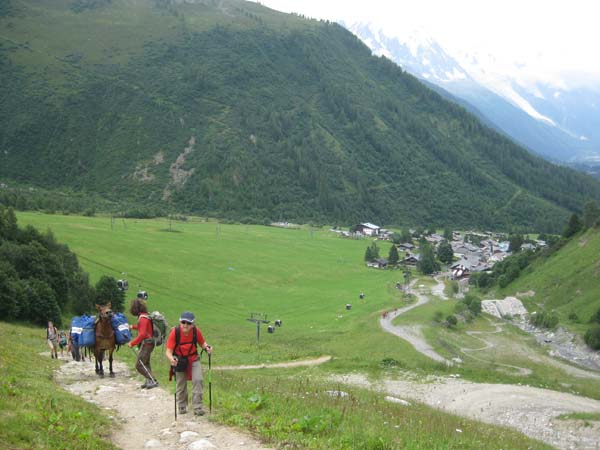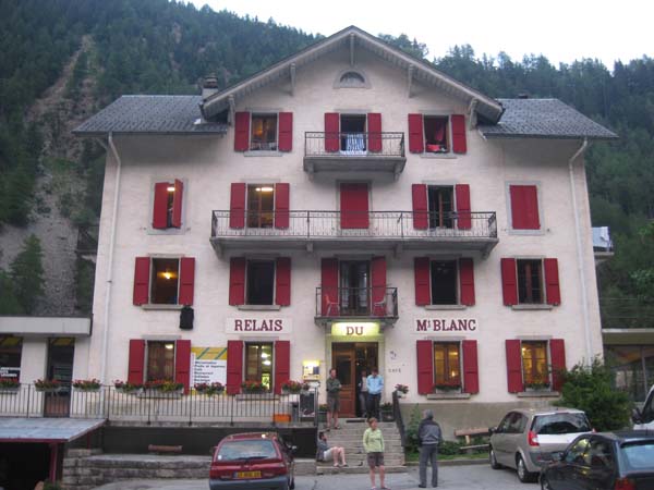 A l’arribada al bosc, el camí manté un ample pendent, amb revolts tancats i inclinats, de fet baixàrem gairebé 940 metres des del coll al poble. Just arribar a les primeres cases l’amenaça de pluja es va fer realitat i ens va obligar a treure les capelines fins arribar al refugi ( Relaix du Mont Blanc). Pujàrem al dormitori comú (pis de dalt) i iniciàrem el ritual de cada dia: dutxa, rentar roba, estendre roba, preparar llit, lectura i… sopar. A les 19:00 sopàrem, a un menjador amb molt de renou, de fet érem més de 100 caminadors sopant alhora i va ser l’únic dia en tota la ruta que mos topàrem amb catalans. Després férem una volta pel poble, això sí, curta, ja que malgrat no trobar-nos massa cansats el sendemà ens esperava un tram més llarg, i ens havíem d’aixecar d’hora. A les 7:00, el dejuni!