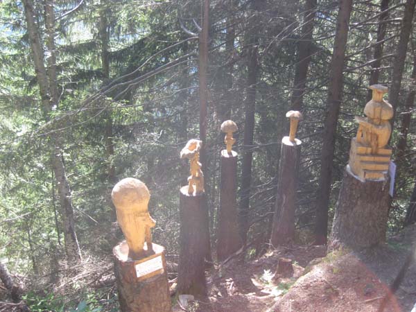 Seguint les indicacions i senyals, arribàrem a un sender ampli que travessa un bosc amb arbres de gran mida. Per tot el camí trobàrem escultures fetes amb els troncs dels arbres, la majoria de bolets; de fet, de bolets en trobàrem un parell de bons que recollírem per afegir a l’amanida del dinar. El camí, per aquest tram, és lleugerament descendent. Quan acabà el bosc baixàrem cap a la vall, al petit poble d’Issert (en aquest punt havíem fet 4 quilòmetres).