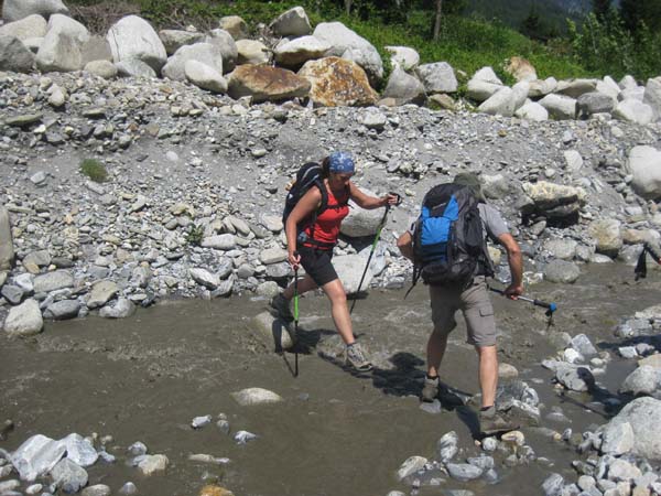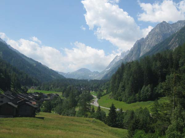 Travessàrem el poble i devora un pont ompliren les cantimplores d’aigua (trobàrem moltes fontetes durant el camí). La ruta ens féu canviar de vessant de la vall, oferint-nos amples vistes de la serralada, plena de grans parets i desafiants agulles de roca. El camí marca un ascens suau però continu, enmig de camps de conreu i prades, travessant el vall de Ferret en la seva llargària. El dia assolellat i la comoditat del camí ens facilità la marxa, així que prest arribàrem a un altre poblet anomenat Praz de Port (1.151 m), on hi havia antigament una duana suïssa. A la dreta poguérem veure la part baixa de les glaceres d’Orny i de Saleina. El següent poblet que trobàrem es diu Branche, una localitat que alterna cases tradicionals (amb façanes folrades de llenya tallada) amb xalets més moderns, ara bé, tot endreçat i net com una patena. A la sortida del poble, després d’esperar un poc, perquè alguns van aprofitar per comprar queviures, ens sortírem del camí i vam haver de travessar el riu per allà on poguérem (per sort ningú va relliscar ni va caure) fins arribar a un prat on ens aturàrem a dinar.