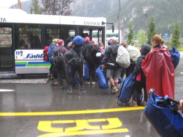 Poc abans d’arribar al refugi d’Elena, plovia a voler. Férem un descans i aprofitàrem per prendre uns capuccinos i unes xocolates ben calentes. Ens costà arrancar, la maleïda pluja no aturava, però havíem de continuar… Així que reprenguérem la marxa sota la barrumbada. Al fons de la vall ens esperaven un autobús i les mules. Haguérem de carregar-nos els sacs i pujar a corre-cuita, el bus era a punt de partir. Estrets i banyats, arribàrem a l’estació d’autobusos de Courmayeur. Allà dinàrem i ens poguérem canviar de roba i estendre el que dúiem banyat. No vérem res del poble, només ens aventuràrem a una cafeteria propera.