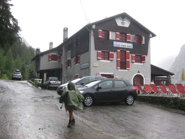 Allà agafàrem un altre autobús fins a un càmping situat a la vall de Veny, tot passant per una tortuosa carretera de muntanya, on seguírem la marxa fins al refugi de Monte Bianco. La pujada a aquest refugi (després d’un parell d’intents per rutes tancades) el férem per una carretera, enmig del la pluja incessant, en una mitja hora.