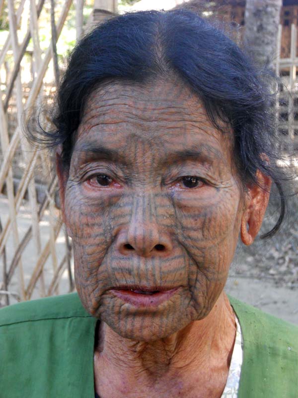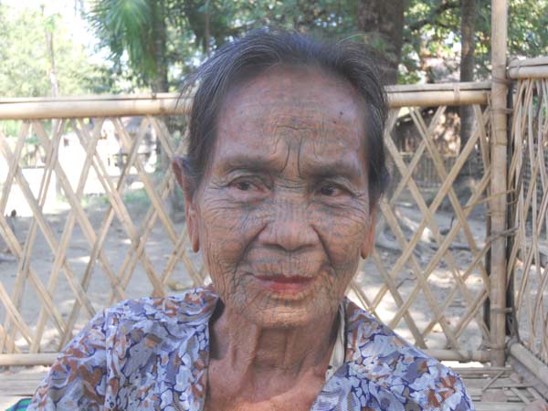 Ètnia de les dones de cara tatuada (Arakhing). Poblet de devora Mrauk U, anomenat Crite Chaung. La tradició del tatuatge ve d’enrere. Eren una raça molt hermosa i eren segrestades per procrear bellesa. Conten que com ho feien en contra de la seva voluntat…decidiren marcar-se la cara i així convertir-se en dones lletges, però lliures!
