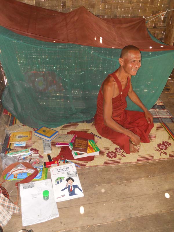 Podeu veure el seu llit, amb mosquitera i el seu gran entreteniment. Llegeix llibres i més llibres, en anglès, i aprèn japonès. Viu amb un altre monjo, a una muntanyeta. Estarà alabat, si un dia, li enviem qualque llibre. Viuen en total senzillesa. És un home molt cult.