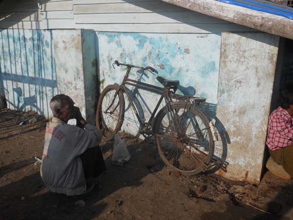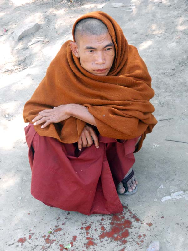 Un de tants monjos budistes rovegant i escopint es “betel” tabac de rovegar. Es carrers estan plens d’aquestes taques. Actualment, hi ha un moviment en contra. Tot es país té esquitxos vermells en terra! Bé, són escopitades.