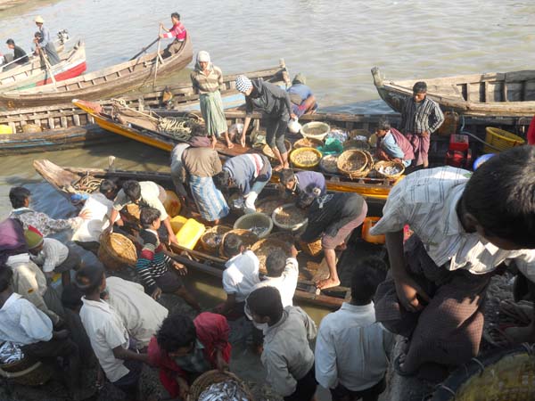 Port de Sittwe. Arribada del peix a les sis i mitja del dematí. Fixau-vos amb la vestimenta dels homes, duen un longyi.