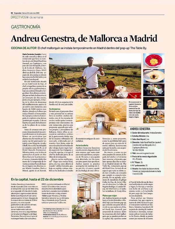 El xef Andreu Genestra ha estat protagonista d’un ampli reportatge al diari Expansión, en el que comenta que restarà temporalment a Madrid.En l’article se poden admirar imatges del cuiner amb Capdepera i el seu local de fons. Altres articles Sant Antoni 2026 /6/ Picarolada multitudinària 17 de gener de 2026 A. Fuster Joiers i Yolanda Izquierdo formen part de la marca Moda Artesana de Mallorca 17 de gener de 2026 Sant Antoni 2026/7/ Combat de glosadors 16 de gener de 2026 Sa pella pes mànec – 21 – Any nou, vida vella… 12 de gener de 2026 Sant Antoni 2026/5/ Auca de les festes de Sant Antoni 16 de gener de 2026 Carta a Cap Vermell: Ulleres trobades a la mar 17 de gener de 2026