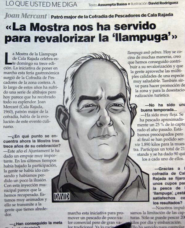 A la secció d’Ultima Hora anomenada “Lo que usted me diga“, escrita per Assumpta Bassa i dibuixada per David Rodríguez, entrevisten al patró major de la Confraria de Pescadors de Cala Rajada, Joan Mercant.