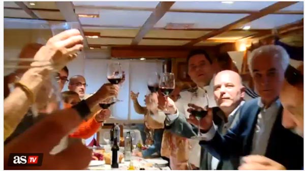 Foren 16 penyistes que viatjaren a Madrid per veure el partit. Tot i que al brindis hem vist un gabellí que ens consta que és del Barça. Devia anar d’infiltrat. Per més senyes, és un ex-regidor. A la dreta foto s’intueix.