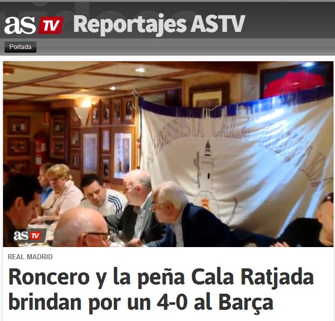 El diari digital AS ens ofereix un reportatge del sopar de la penya madrilista de Cala Rajada amb el periodista més madrisita de tots, Tomàs Roncero. En el vídeo podeu veure una entrevista amb el president de la penya, que sorpren a Roncero per l’optimisme mostrat en pronòstic del resultat contra en Barcelona.