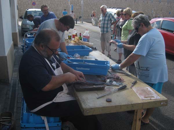 Mariners i col·laboradors comencen a preparar la llampuga que se servirà el proper diumenge.
