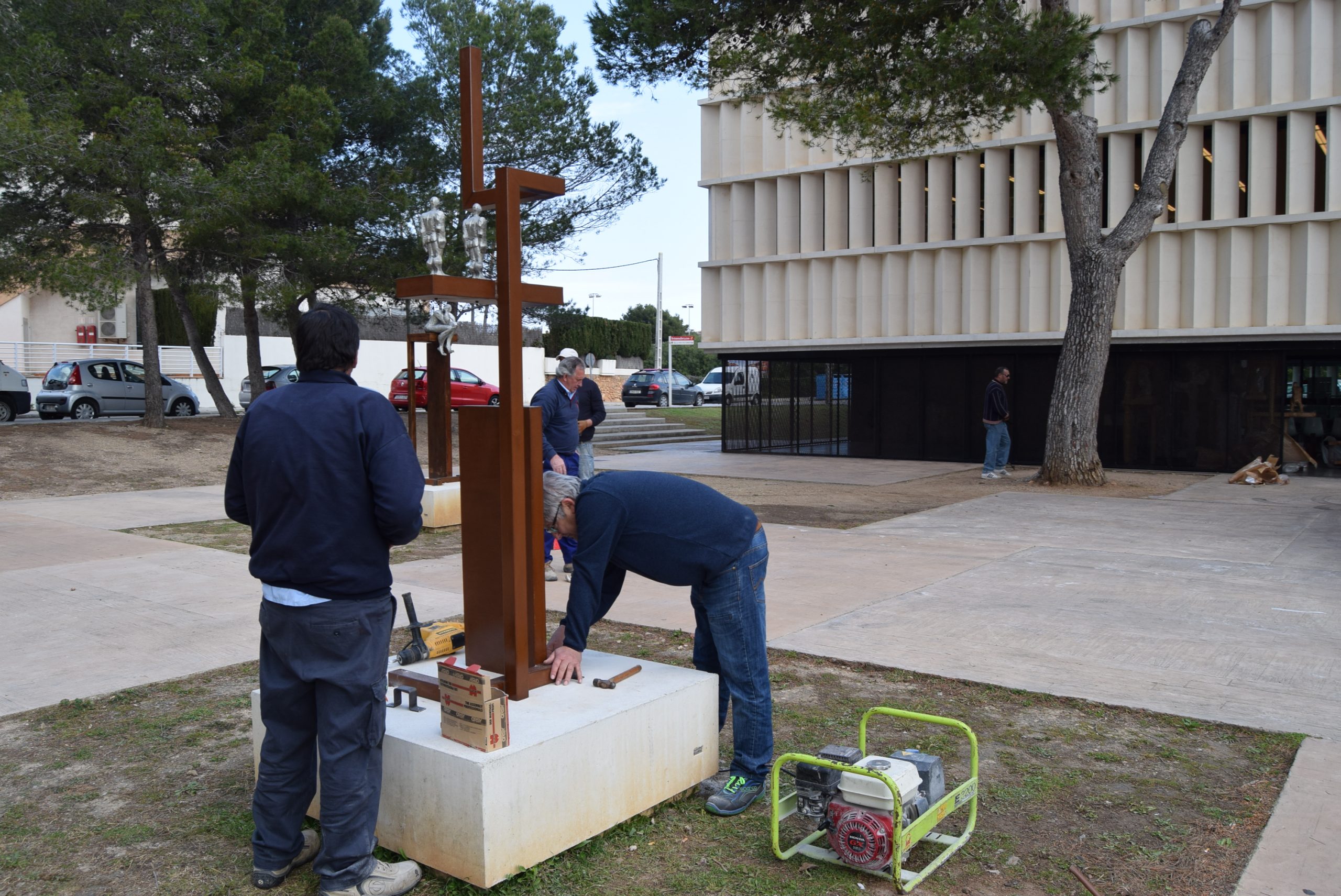 Dia 15 de març era el dia senyalat. En Sebas de la brigada ha complit l’edat reglamentària per jubilar-se i amb el muntatge de les escultures de Moisès Gil ha fet el seu darrer dia de feina.