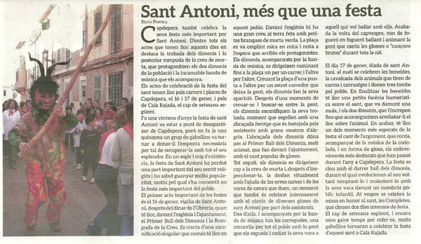 Diari de Balears ha editat un suplement dedicat a les festes de Sant Antoni a la part forana de Mallorca. Se reparteix gratüitament ( l’ajuntament en trobareu, si n’estau interessats) i recull els programes de les festes, entrevistes als obrer i reportatges de com són ls festes a cada poble.