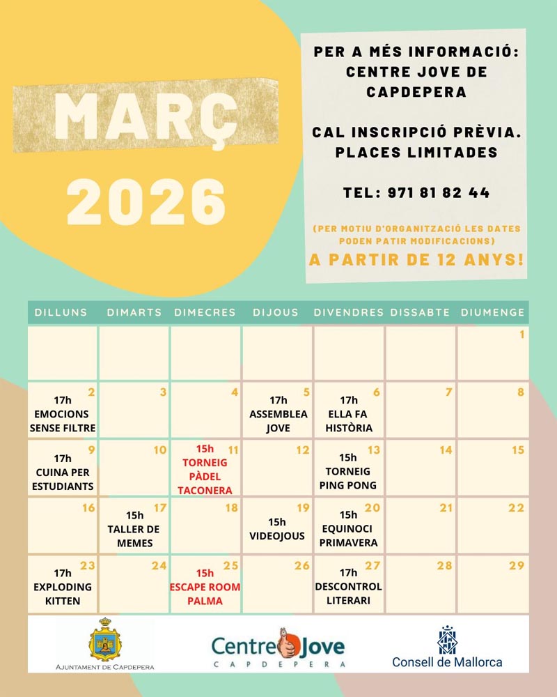 Dijous, 4 de març, a l’horabaixa es va celebrar l’assemblea jove del mes de març al centre jove de Capdepera, on els joves i al·lotes van decidir realitzar una nova sortida hípica per als i les que no van poder anar a la primera, la ja tradicional excursió a la Fira del Ram i al camp de tirolines i escalada de Jungle Park.