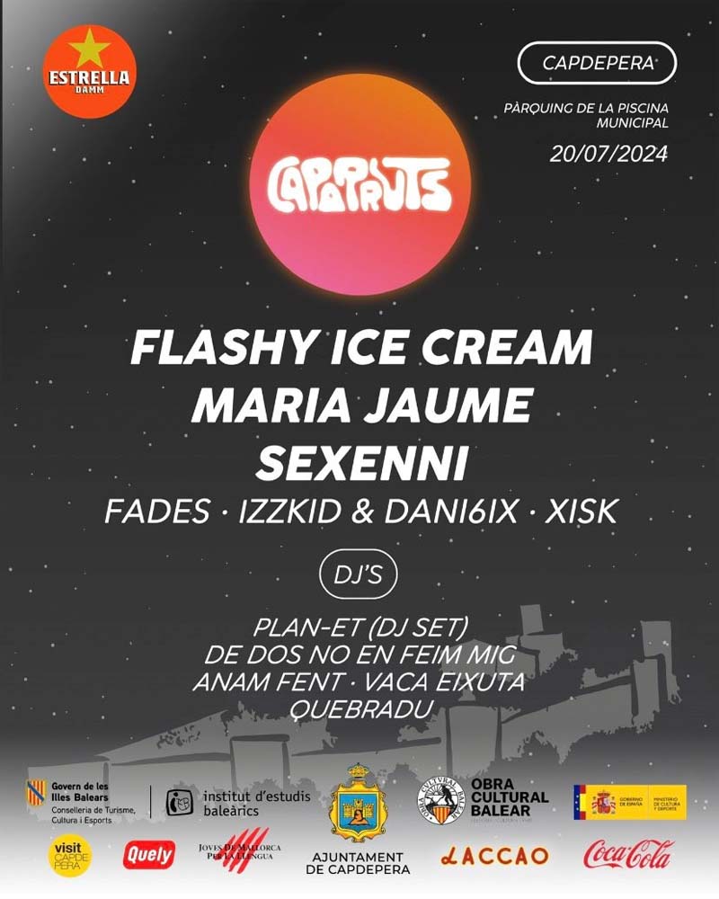 Pel que fa a l’altre esdeveniment, el Festival Caparruts, tendrà lloc el pròxim 20 de juliol a l’aparcament de la piscina municipal (podeu adquirir les entrades a ticketib.com), un concert organitzat bàsicament per joves del nostre poble, constituïts recentment en associació, i que oferirà l’actuació de grups o cantants de nivell, com ara Flashy Ice Cream, Maria Jaume o Sexenni. Un concert del qual Cap Vermell ja us ha oferit informació, amb una entrevista als seus organitzadors.