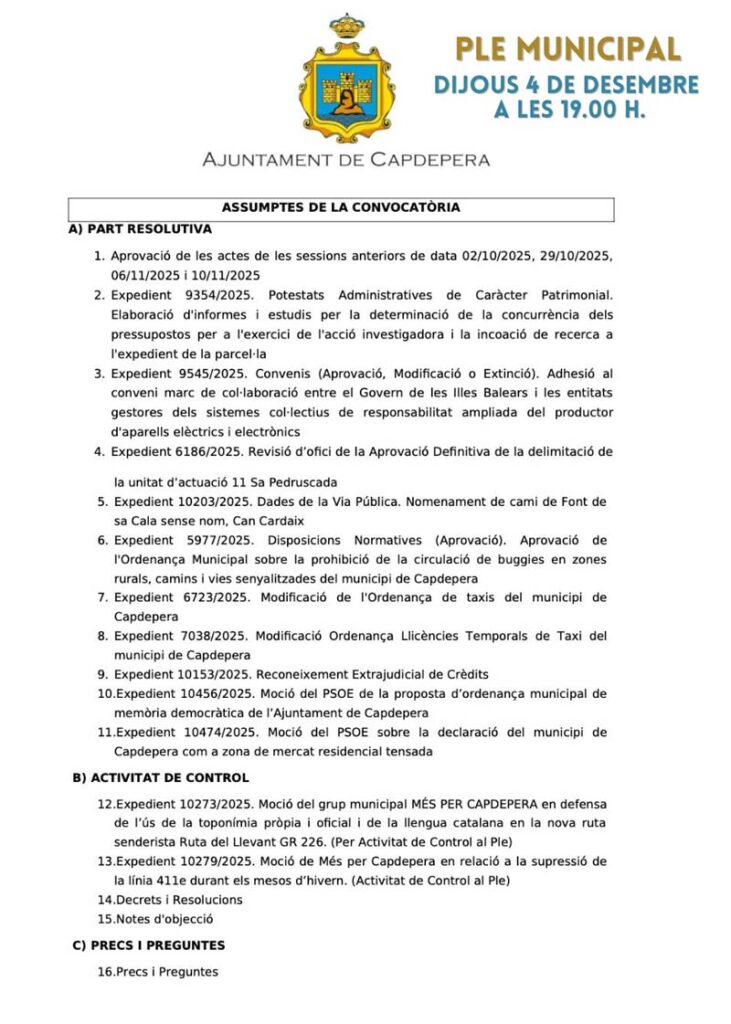 Finalment, pel que fa als punts de l’ordre del dia, es varen aprovar tres mocions: dues de Més per Capdepera per canviar el nom de la ruta senderista East Mallorca a Ruta del Llevant i per recuperar la línia de bus exprés 411 E, que connecta Palma amb el Llevant i que el Govern ha suprimit a l’hivern. I una del PSOE per declarar Capdepera municipi tensionat en matèria d’habitatge. Una altra moció del PSOE per aprovar una ordenança municipal de memòria històrica no es va tractar ja que una moció no és la via legal per a aprovar-la. En tot cas la batlessa va anunciar que es faran reunions per a redactar-la.