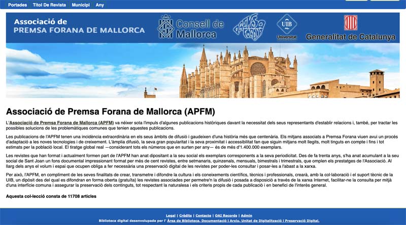 L’Associació de Premsa Forana de Mallorca (APFM), en col·laboració amb el Servei de Biblioteca i Documentació de la Universitat de les Illes Balears (UIB), ha culminat una nova fase del projecte de digitalització del seu fons, sumant 1.999 nous números de revistes de premsa forana a la Biblioteca Digital de les Illes Balears (BDIB). Això ha estat possible gràcies a una subvenció del Servei de normalització Lingüística del Consell de Mallorca.