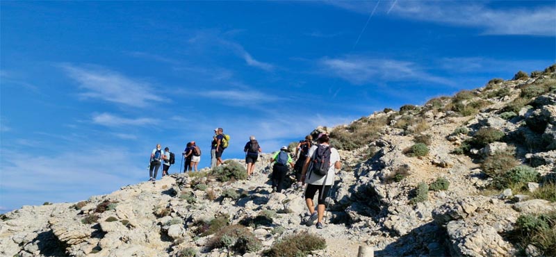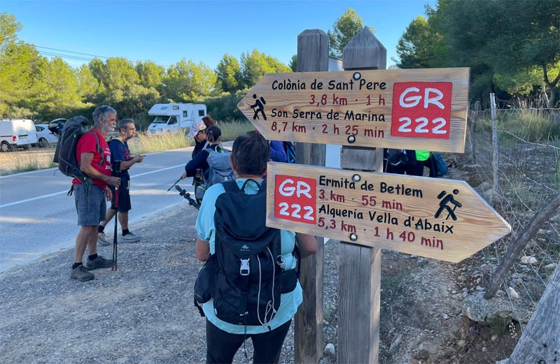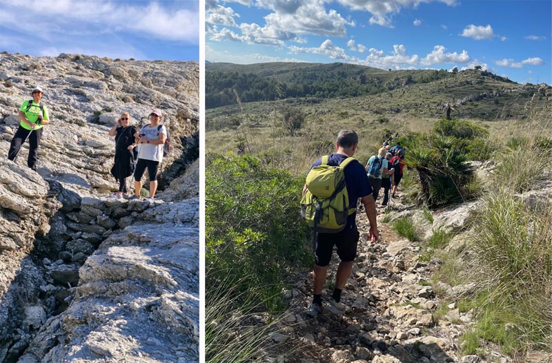 Seguidament, tornam una mica enrera per iniciar la pujada per una pendent no tan pronunciada com l’anterior, en un dia assoleiat, que fins i tot a alguns excursionistes els semblà calorós. Passam pels Establits, font d’una tesina per part d’una estudiant artanenca. El guia ens recorda que hi ha una zona reservada a l’observació dels voltors i pots ésser penalitzar per passar per allà. De voltors en veim un de magestuós i negre. Després de davallar entre pedres grosses ens topam amb les cases de l’Alqueria Vella i aprofitam per fer una petita aturada per reparar forces, alguns miren el gran mapa que hi ha a l’aparcament mentre d’altres aprofiten per beure un glop d’aigua.