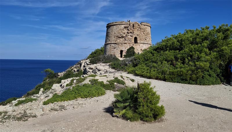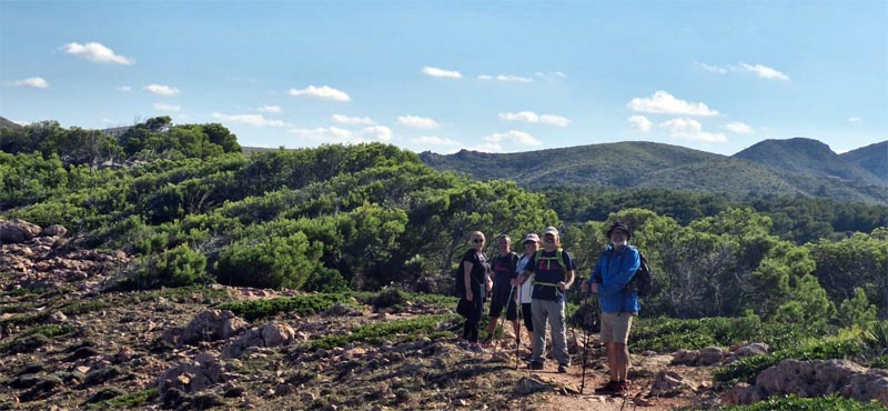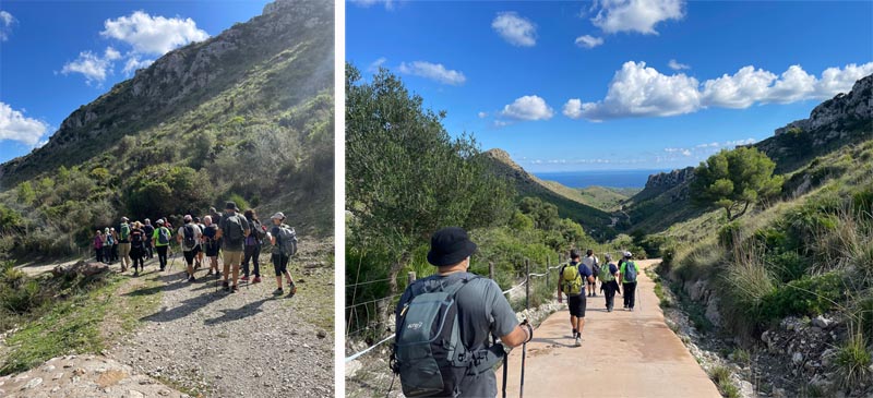 Posteriorment, seguim el camí que ens portarà fins a les cases des Verger, després d’obrir i tancar un parell de tanques i després d’una petita pujada, ens apropam per la pista encimentada a les cases. D’altra banda, ens creuam amb algun ciclista i més d’un corredor, a l’altra banda del camí es pot albirar la mar, que es presenta com un punt d’arribada a prop de les platges del parc, una d’elles cala Torta, serà el nostre objectiu. Les cases no tenen ja la utilitat que tenien fa un temps i sembla que la font des Verger ja no porta aigua, i les vaques ja no regenten els estables. D’altra banda, el camí és bo de dur, mentre que impressiona que a banda i banda hi hagi grans muntanyes algunes d’elles reforestades per mor dels incendis tal i com narra el guia, que hi formà part. Seguim fins a les cases d’Albarca, passam pel pi que roman totsol vora el camí i abans d’arribar a la torre des Matzoc, cercam una esplanada per poder-hi dinar.