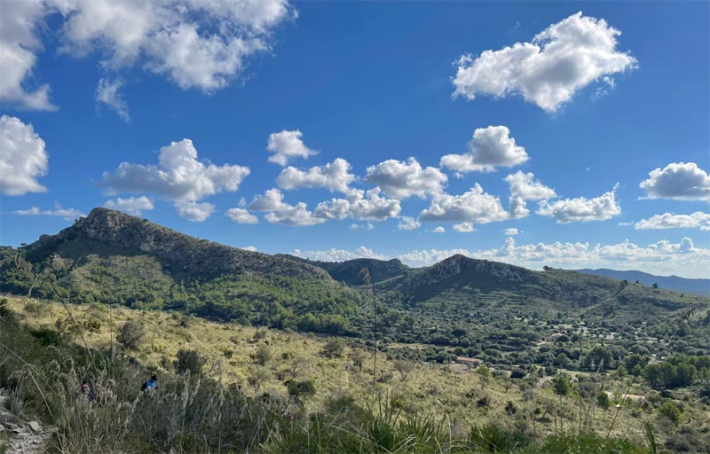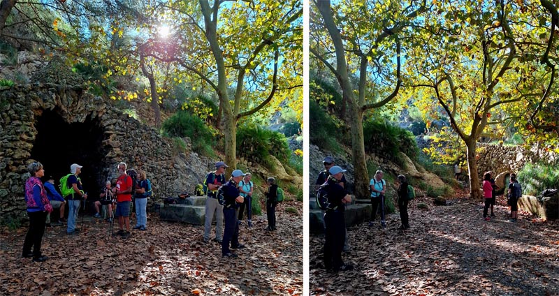 Primerament, pujàrem pel rost que hi ha a Betlem i ens endinsàrem en els espadats que conformen el coster de la muntanya que puja cap a l’ermita. Mentre avançàvem el camí es feu més lleuger gràcies a la conversa i a les hermoses vistes sobre Son Serra i la badía d’Alcúdia, amb la mar poderosa al fons. Entre càrritx i còdols pujàvem xino-xano, fins que arribàrem a la font de l’ermita, on berenàrem sota l’atenta mirada dels plataners i pins i l’auspici de la mare de Déu de Lourdes. Després de berenar reprenem el camí que ens portaran a les cases de l’Alqueria Vella.