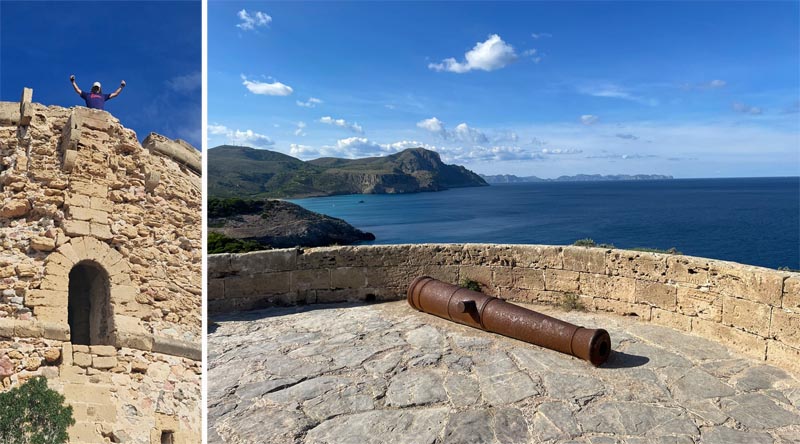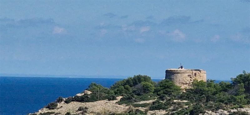 Després de l’àpat generós i tranquil arribam fins a la torre des Matzoc, del segle XVII, situada dins el litoral de sa Cova, dalt del promontori de sa Falconera, on aprofitam per fer la fotografia de grup i explorar els espais de la torre. El sol és a dalt i el vent comença a fer una mica d’acte de presència sobre la torre.