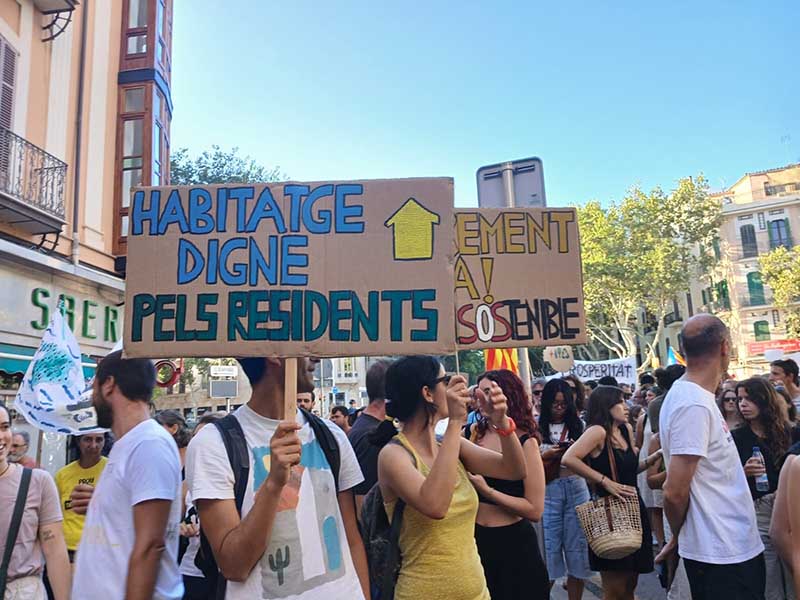 Som aquí per exigir un canvi de rumb radical de la nostra realitat social, econòmica, ambiental i cultural. No hi som només per denunciar la massificació i la saturació turística que patim, això és just un efecte, però no l’origen dels problemes. L’origen dels conflictes socials, territorials i ambientals que vivim és un model econòmic basat en el monocultiu intensiu turístic, un model que es fonamenta en batre rècords anuals de turistes que arriben – 20 milions previstos per enguany – que destrueix el territori, explota i precaritza el treball de qui el sosté, enriqueix la classe empresarial, genera desigualtats, expolia els recursos naturals, i mercantilitza i especula amb els béns comuns i serveis de primera necessitat, com és el cas flagrant del drama actual de l’habitatge, que s’ha convertit en una mercaderia al servei del negoci turístic. Un drama que afecta ja a gairebé tothom: a treballadors (sanitaris, docents, funcionaris) que no trobem on viure al lloc on els han destinat, als residents, a les persones que venen per cobrir els requeriments laborals dels sectors vinculats directa o indirectament amb el sector turístic de forma cada cop més precaritzada, i especialment a persones migrants, dones i joves.