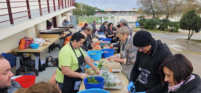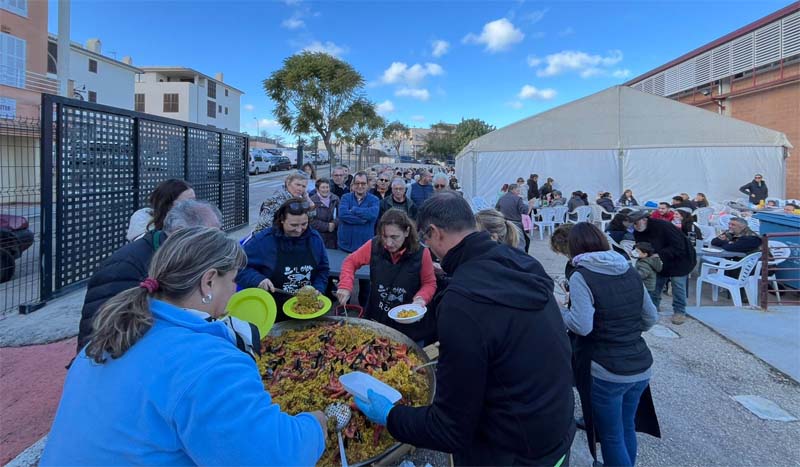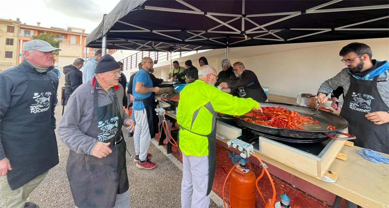Així els arrossers i arrosseres de les Festes del Carme, després de cercar un lloc o molestés menys el vent, berenaren i se posaren el davantal per a preparar els ingredients de les paelles. Tenien feina amb més de 700 comensals prevists, de fet arribaren als 750 (74 quilograms d’arròs). A partir de les 14 hores les paelles de 100/ 120 racions van anar sortint una rere l’altra, en total se van fer 8 paelles.