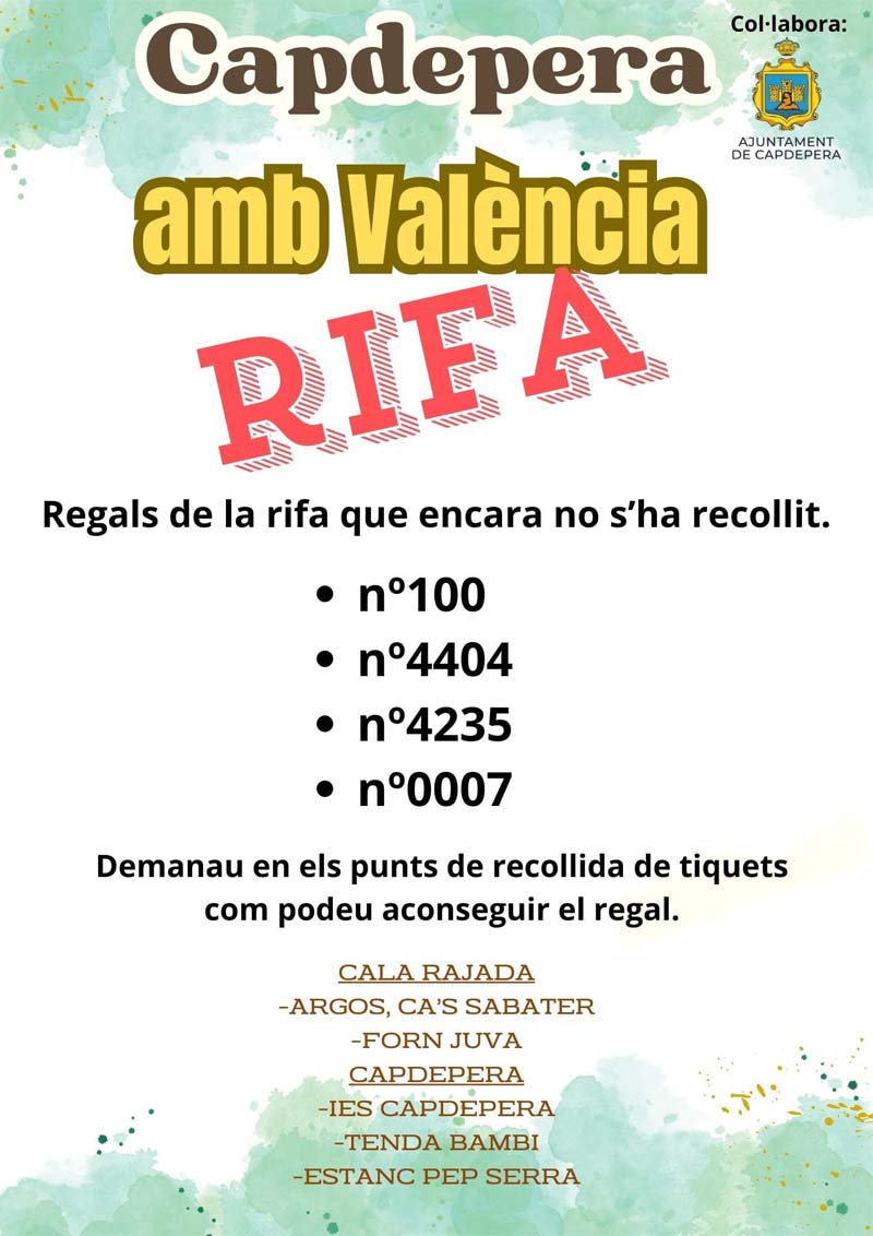 Diumenge, 8 de desembre va tenir lloc la diada solidària per recaptat doblers pels damnificats de la DANA de València. Diverses associacions del poble i l’IES Capdepera van organitzar una diada amb una part infantil pel dematí (que se va haver de suspendre per la climatologia), un dinar de paella i un horabaixa musical.