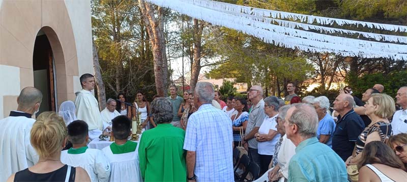 Els assistents anaren arribant als voltants de la capella i abans de començar la cerimònia, pogueren visitar l’interior de la capella i comprovar l’estat actual, així com comprovar l’estat anterior en unes fotografies que s’exposaven a l’interior. Una vegada tot a punt, començà la missa oficiada per mossèn Xisco Bernabeu, mossèn Pere Orpí, amb l’ajuda dels habituals escolanets de les dues parròquies i els cants de les dues corals parroquials. Començà agraint a tots aquells que participaren tant amb la restauració, com amb els actes i accions per recaptar fons per fer front a les despeses.