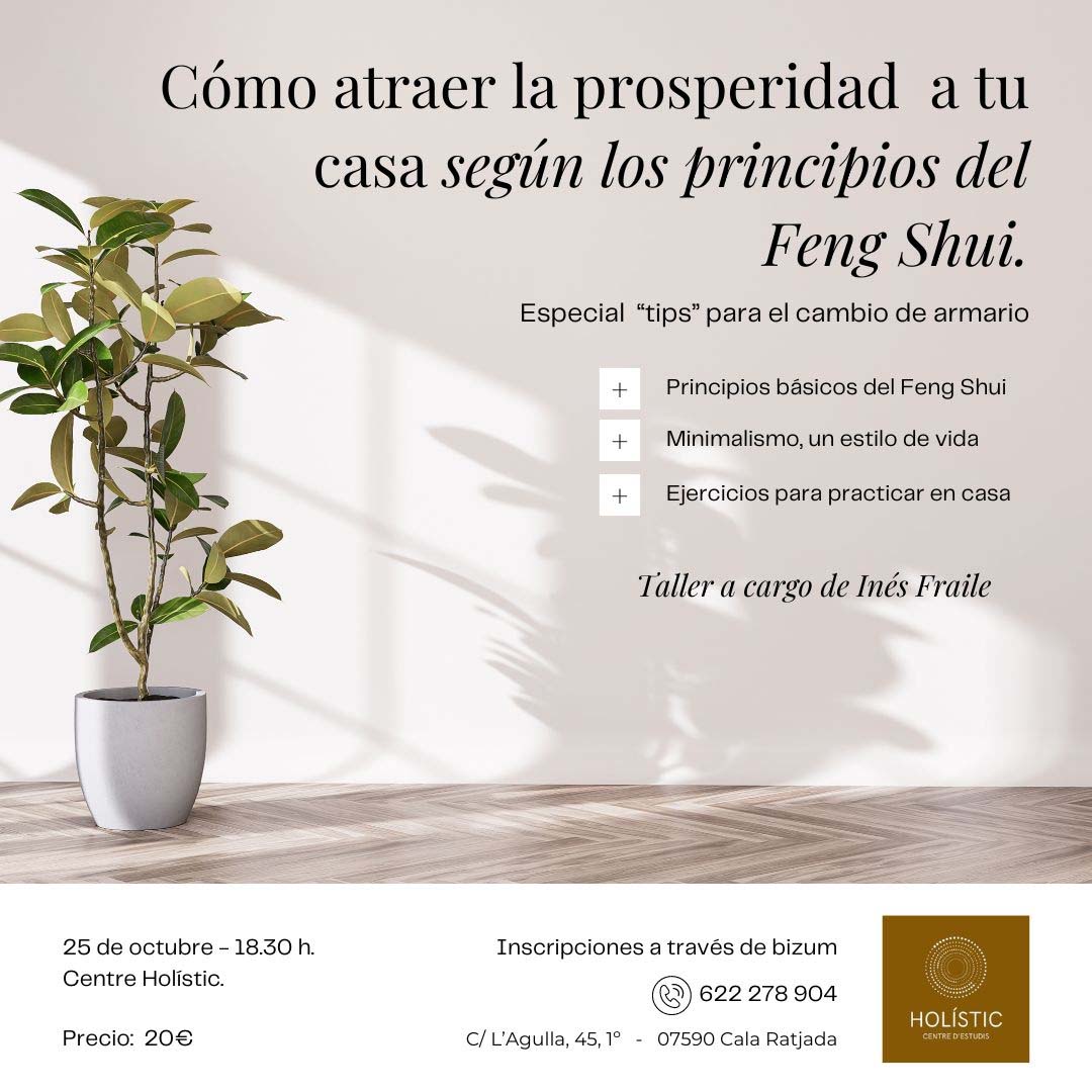 Ens complau oferir-vos aquest nou taller, que vos presentarà les vies per atreure la prosperitat a les vostres cases d’acord als principis del Feng Shui. Impartit per Inés Fraile. El proper 25 d’octubre al Centre Holístic de Cala Rajada!