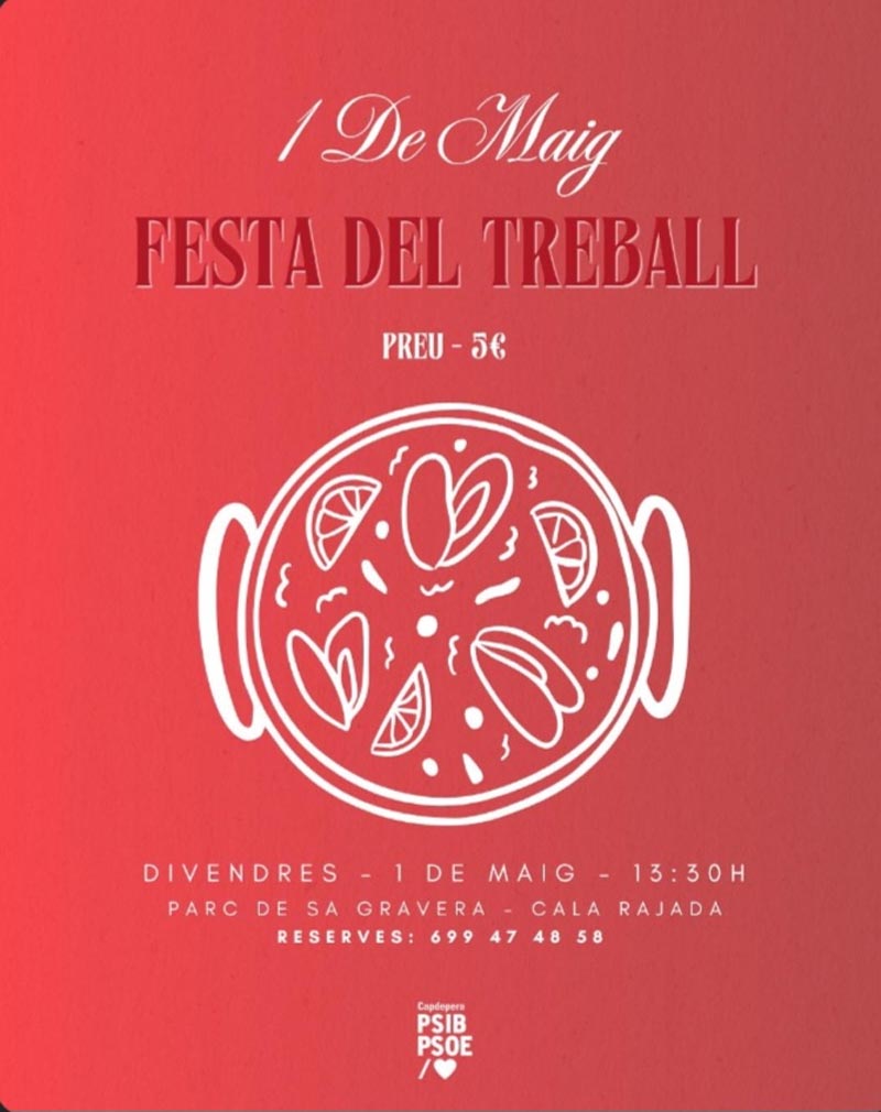 Vos informam de que el 1 de Maig cel·lebrarem una Paella popular en el Parc de Sa Gravera a les 13:30h, organitzada pel Partit Socialista i esperam comptar amb l’ assistencia de la nostra Secretaria General de Mallorca Amanda Fernandez Rubí.