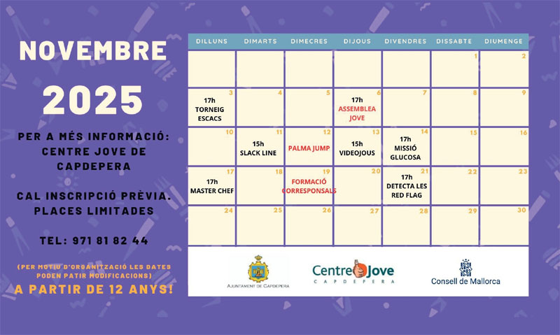 Aquestes són les activitats del Centre Jove de Capdepera pel mes de novembre 2025: