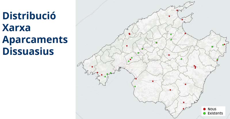El Consell de Mallorca ha presentat el Pla d’Aparcaments Dissuasius, situats vora les estacions de transport públic dels pobles de Mallorca, amb 7.171 places. Es tracta de 43 estacionaments, 16 dels quals són propietat municipal i es reformaran, mentre que 27 són de nova creació. La inversió prevista pel Consell de Mallorca amb aquest Pla és de 30,9 milions d’euros.